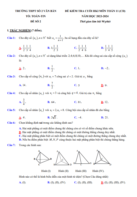 Đề tham khảo cuối học kì 1 (HK1) lớp 11 môn Toán CD năm 2023 2024 trường THPT Văn Bàn 2 Lào Cai
