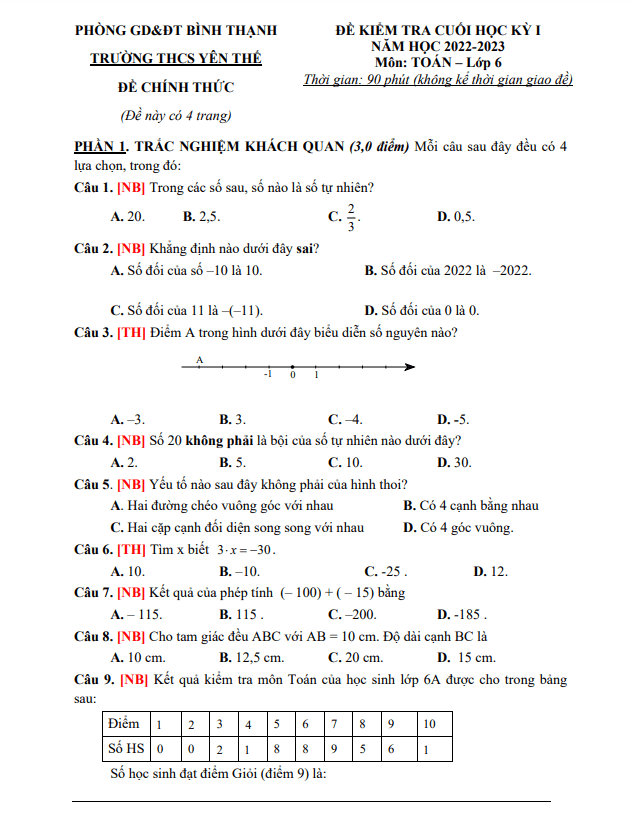 Đề tham khảo cuối học kì 1 Toán lớp 6 trường THCS Yên Thế TP HCM