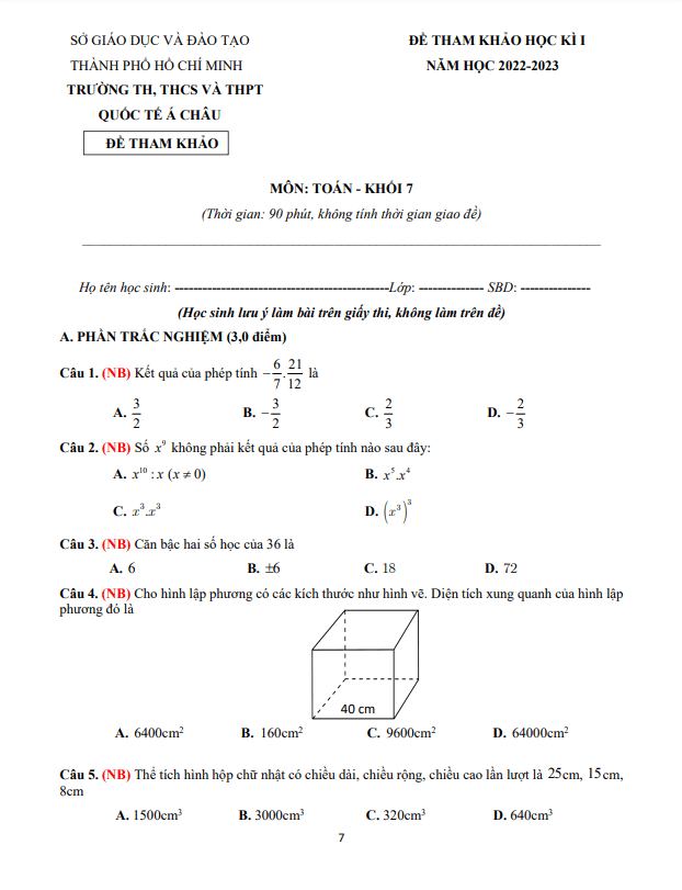 Đề tham khảo cuối kỳ 1 Toán lớp 7 năm 2022 – 2023 trường Quốc tế Á Châu – TP HCM