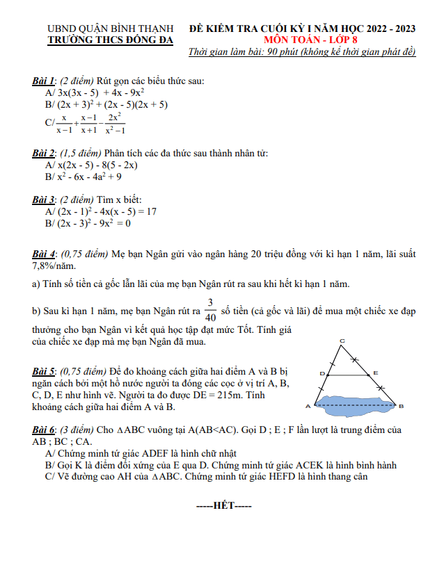 Đề thi tham khảo cuối học kỳ 1 Toán lớp 8 năm 2022-2023 trường THCS Đống Đa TP HCM
