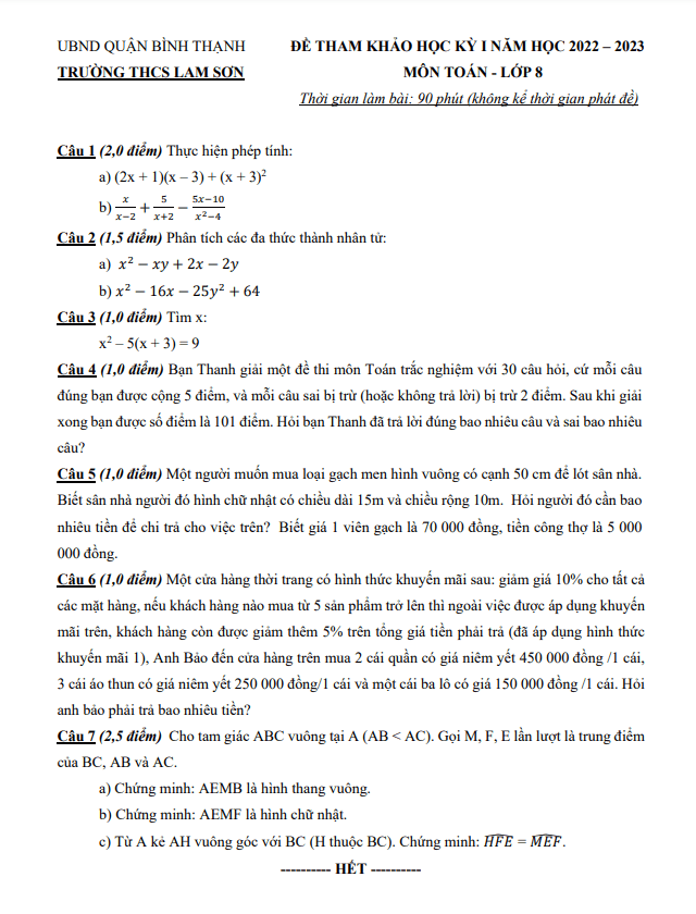 Đề tham khảo cuối học kì 1 (HK1) lớp 8 môn Toán năm 2022 2023 trường THCS Lam Sơn TP HCM