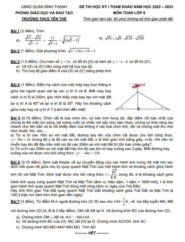 Đề tham khảo cuối học kì 1 (HK1) lớp 9 môn Toán năm 2022 2023 trường THCS Yên Thế TP HCM