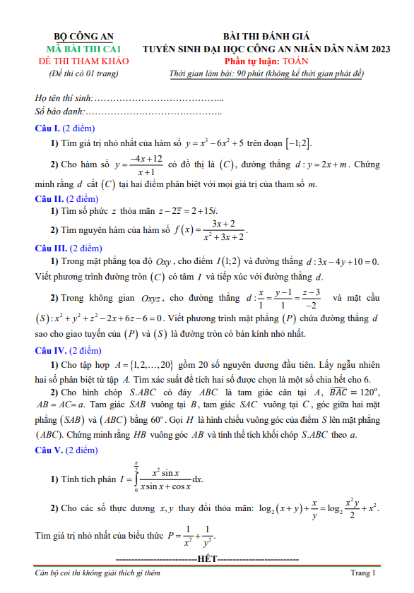Đề thi tham khảo tuyển sinh Đại học Công An Nhân Dân năm 2023 môn Toán