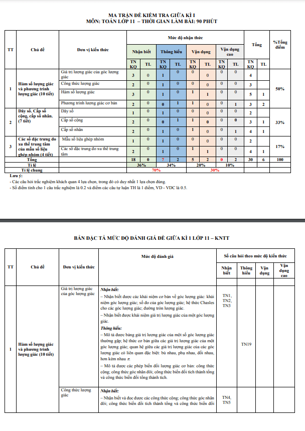 Sytu xin gửi đến quý thầy cô và các em học sinh lớp 11 đề tham khảo giữa kì 1 môn Toán Kết Nối Tri Thức Với Cuộc Sống (KNTTVCS) năm học 2023 – 2024 của Sở Giáo dục và Đào tạo Thanh Hóa. Đề thi bao gồm 30 câu trắc nghiệm và 6 câu tự luận, thời gian làm bài 90 phút.Nội dung của đề thi tập trung vào các chủ đề sau:1. Hàm số lượng giác và phương trình lượng giác (10 tiết): bao gồm giá trị và công thức lượng giác của góc, hàm số lượng giác, phương trình lượng giác cơ bản.2. Dãy số. Cấp số cộng, cấp số nhân (7 tiết): bao gồm cấp số cộng, cấp số nhân trong dãy số.3. Các số đặc trưng đo xu thế trung tâm của mẫu số liệu ghép nhóm (4 tiết): bao gồm mẫu số liệu ghép nhóm và các số đặc trưng đo xu thế trung tâm.Đề thi có cấu trúc 4 lựa chọn cho câu hỏi trắc nghiệm, với điểm 0.2 cho mỗi câu. Điểm các câu tự luận và VD – VDC là 1 điểm và 0.5 điểm tương ứng. Đề tham khảo này sẽ giúp học sinh ôn tập và kiểm tra kiến thức của mình trong môn Toán, đồng thời chuẩn bị tốt cho kỳ thi cuối kì. Chúc quý thầy cô và các em học sinh thành công trong việc ôn tập và thi cử!