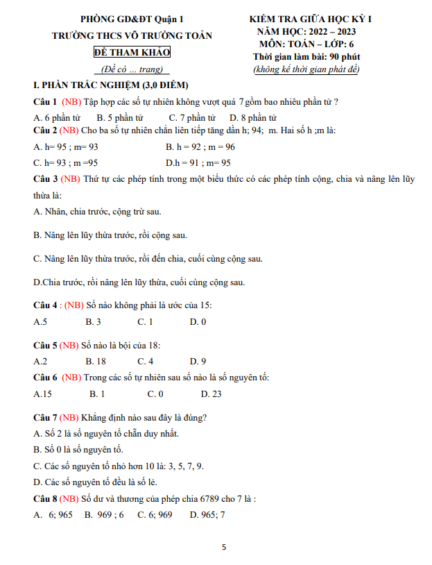 “Chào quý thầy cô và các em học sinh lớp 6! Sytu xin giới thiệu đến mọi người đề tham khảo cho bài kiểm tra giữa học kỳ 1 môn Toán của lớp 6 tại trường THCS Võ Trường Toản, TP HCM. Đề thi này được biên soạn theo hình thức trắc nghiệm và tự luận, với phần trắc nghiệm gồm 12 câu (03 điểm) và phần tự luận gồm 07 câu (07 điểm). Thời gian làm bài là 90 phút và đề thi có đáp án trắc nghiệm, lời giải chi tiết và hướng dẫn chấm điểm.Một trong những câu hỏi trong đề thi là “Dùng thước thẳng và phấn, hãy vẽ hình bình hành ABCD có cạnh AB bằng 5cm và đường chéo AC bằng 7cm.” Câu này giúp học sinh rèn luyện kỹ năng về hình học và đo lường.Bên cạnh đó, đề thi cũng đưa ra tình huống thực tế về việc chia sẻ với những người gặp khó khăn do dịch bệnh. Bạn Minh đã tổ chức chiến dịch góp sách, vở và bút bi cho các em học sinh khó khăn trong trường. Câu hỏi liên quan đến việc chia đồ thành các phần quà đều nhau giúp học sinh rèn luyện kỹ năng về phân số và phép chia.Đề thi này không chỉ giúp học sinh ôn tập kiến thức mà còn khuyến khích họ có tình thần hướng ngoại và chia sẻ. Hy vọng rằng đề thi sẽ giúp các em tự tin làm bài và có kết quả tốt trong kỳ thi sắp tới. Cảm ơn quý thầy cô và các em đã quan tâm và chuẩn bị cho bài kiểm tra của mình. Chúc các em thành công!”
