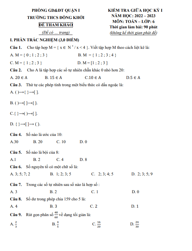 Sytu xin gửi đến quý thầy cô và các em học sinh lớp 6 đề thi tham khảo giữa học kì 1 môn Toán năm học 2022-2023 của trường THCS Đồng Khởi, TP HCM.Đề thi được thiết kế với hình thức trắc nghiệm kết hợp tự luận, bao gồm 12 câu trắc nghiệm và 7 câu tự luận. Thời gian làm bài là 90 phút (không tính thời gian phát đề). Đề thi có đáp án trắc nghiệm, lời giải chi tiết cho phần tự luận và hướng dẫn chấm điểm.Một trong những câu hỏi trong đề thi là: Lớp bạn Hoa cần chia 171 chiếc bút bi, 63 chiếc bút chì và 27 cục tẩy vào các túi quà cho trung tâm trẻ mồ côi sao cho số lượng bút bi, bút chì và cục tẩy trong mỗi túi là như nhau. Hãy tính số lượng túi quà nhiều nhất mà lớp Hoa có thể chia, cũng như số lượng của mỗi loại bút trong mỗi túi.Ngoài ra, đề còn có câu hỏi khác như: Bạn An mua 5 cây bút bi và 6 quyển tập cùng loại. Giá tiền của mỗi quyển tập là 10,000 đồng. Nếu bạn đưa 200,000 đồng và được trả lại 125,000 đồng, hãy tính giá tiền của mỗi cây bút mà bạn An đã mua.Hãy tham khảo toàn bộ đề thi để chuẩn bị tốt cho kỳ kiểm tra chất lượng giữa học kỳ 1 năm học 2022-2023. File Word đầy đủ có sẵn để quý thầy cô tải về và sử dụng. Chúc các em học sinh thành công và hoàn thành tốt bài kiểm tra của mình!