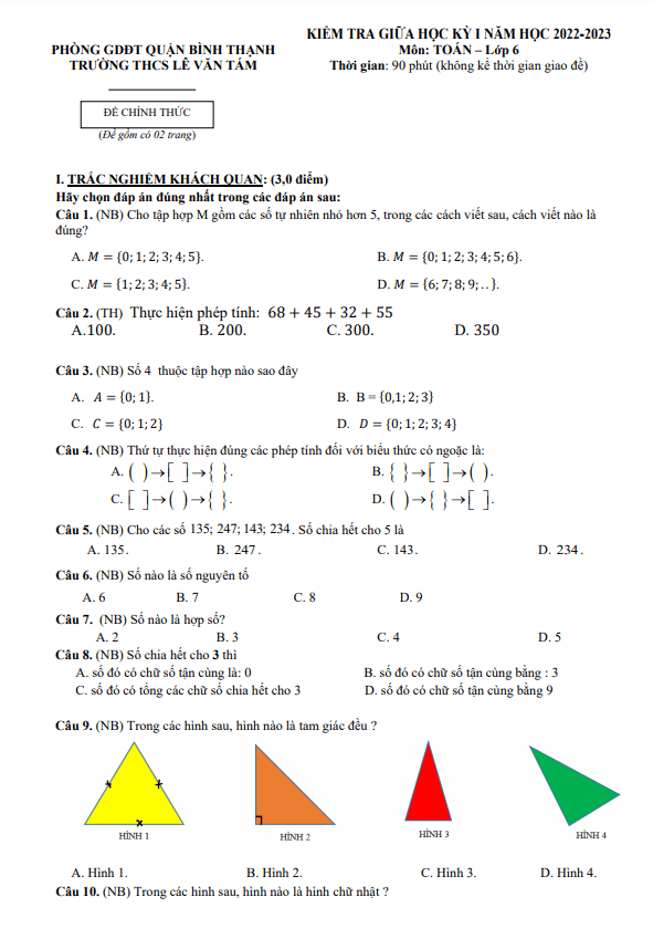 Đề tham khảo giữa học kỳ 1 Toán lớp 6 năm 2022 – 2023 trường THCS Lê Văn Tám TP HCM