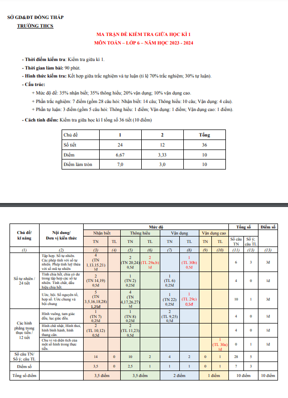 Ma trận Đề tham khảo giữa kì 1 Toán lớp 6 năm 2023 – 2024 sở GD&ĐT Đồng Tháp: