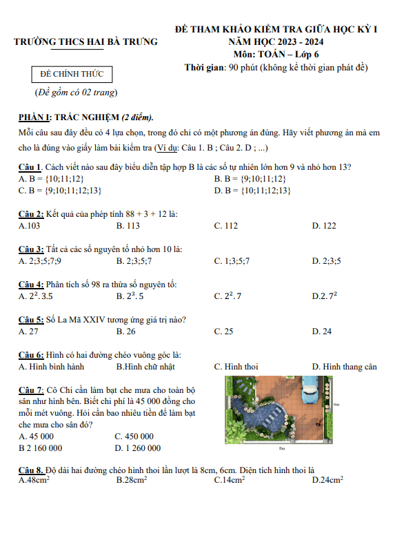 Đề tham khảo giữa học kì 1 Toán lớp 6 năm 2023-2024 trường THCS Hai Bà Trưng TP HCM
