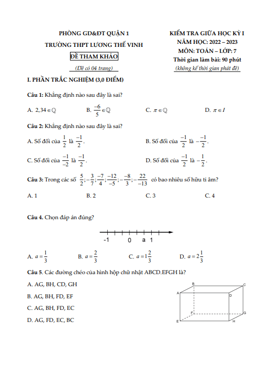 Đề thi tham khảo giữa học kỳ 1 Toán lớp 7 năm 2022-2023 THCS Lương Thế Vinh TP HCM