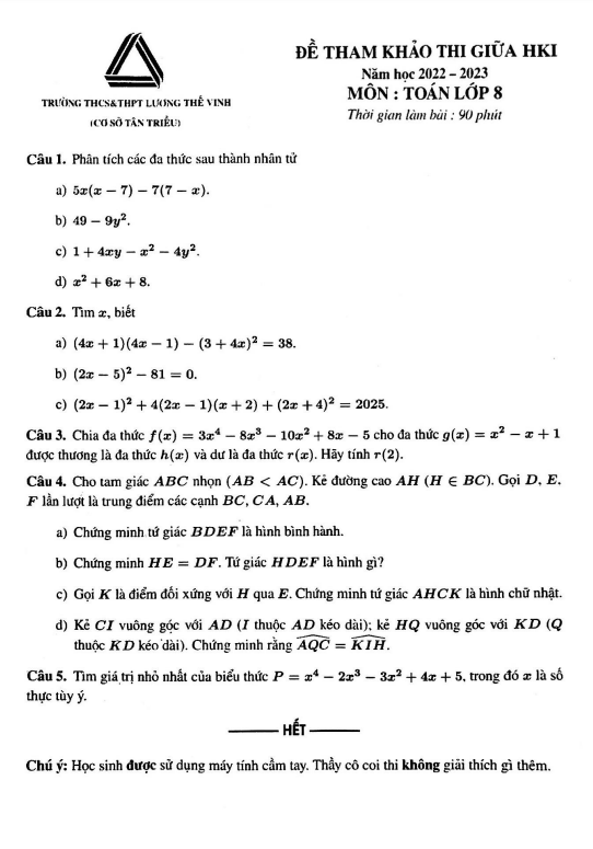 Trên đây là nội dung của đề tham khảo giữa học kì 1 môn Toán lớp 8 năm học 2022-2023 tại trường Lương Thế Vinh. Chúc quý thầy cô và các em học sinh ôn tập hiệu quả và đạt kết quả tốt trong kỳ thi sắp tới!