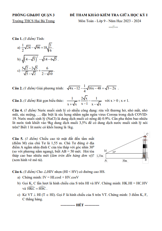 Sytu xin gửi đến quý thầy cô và các em học sinh lớp 9 đề tham khảo kiểm tra giữa học kỳ 1 môn Toán năm học 2023 – 2024 tại trường THCS Hai Bà Trưng, TP HCM. Đề thi bao gồm đáp án, lời giải chi tiết và hướng dẫn chấm điểm để giúp các em ôn tập hiệu quả.