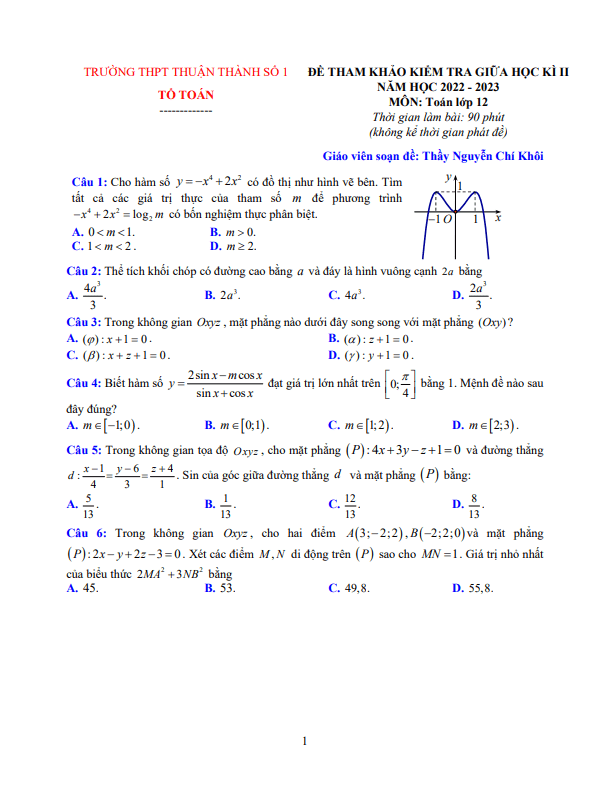 Đề tham khảo giữa học kì 2 (HK2) lớp 12 môn Toán năm 2022 2023 THPT Thuận Thành 1 Bắc Ninh