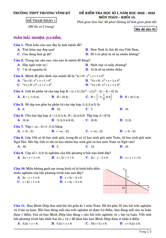 Đề tham khảo này sẽ giúp học sinh lớp 10 ôn tập kiến thức, rèn luyện kỹ năng giải bài tập, chuẩn bị tốt nhất cho kỳ thi cuối học kì 1. Hy vọng rằng đề thi sẽ giúp các em tự tin và hiệu quả trong việc học tập và ôn thi môn Toán. Chúc các em thành công!