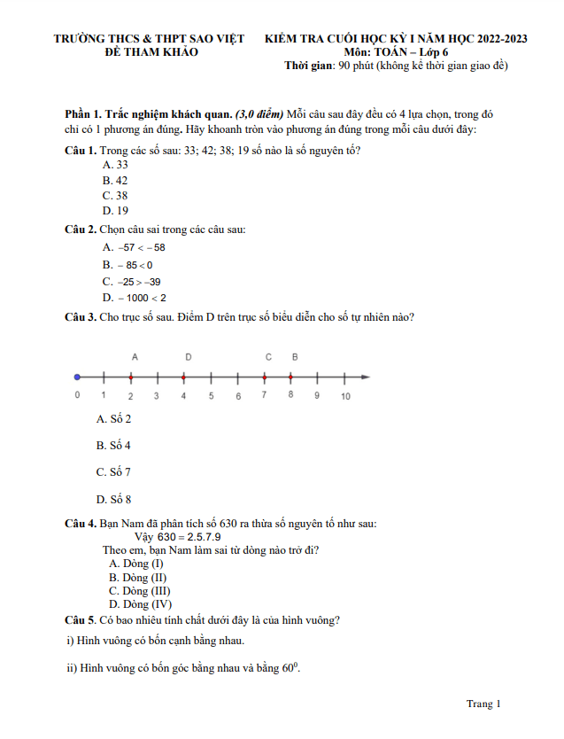Đề tham khảo học kỳ 1 Toán lớp 6 năm 2022 – 2023 trường Sao Việt TP HCM