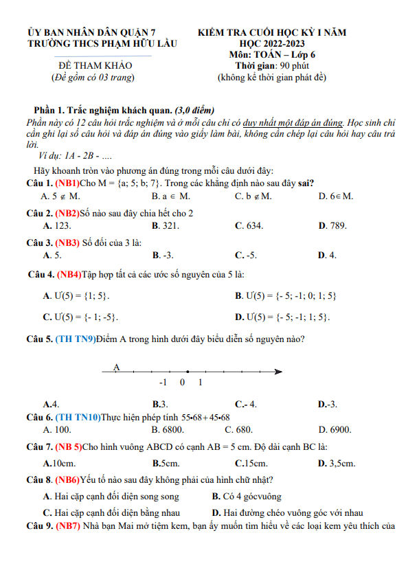 Đề tham khảo học kỳ 1 Toán lớp 6 năm 2022 – 2023 trường THCS Phạm Hữu Lầu TP HCM