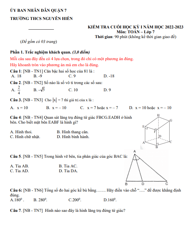 Bộ đề tham khảo học kỳ 1 môn Toán lớp 7 năm học 2022 – 2023 tại trường THCS Nguyễn Hiền, TP HCM là tài liệu hữu ích giúp học sinh ôn tập kiến thức và chuẩn bị cho kỳ thi cuối học kỳ. Đề thi được biên soạn theo hình thức 30% trắc nghiệm kết hợp 70% tự luận, thời gian làm bài 90 phút, không kể thời gian giao đề. Nội dung đề thi mang tính thực tế, áp dụng kiến thức Toán vào cuộc sống hàng ngày. Ví dụ, một câu hỏi yêu cầu học sinh tính tỉ số vải bán được trong hai ngày khác nhau, hoặc tính thể tích hồ bơi dạng hình hộp chữ nhật. Đối với câu hỏi về lăng trụ đứng tứ giác, học sinh được thử thách kiến thức về hình học không gian.Bộ đề cung cấp đáp án, hướng dẫn giải chi tiết và thang chấm điểm, giúp học sinh tự kiểm tra và tự đánh giá khả năng của mình. Đây không chỉ là công cụ học tập hiệu quả mà còn là cơ hội để học sinh rèn luyện kỹ năng giải quyết vấn đề và tư duy logic.Với bộ đề tham khảo này, hy vọng học sinh sẽ nắm vững kiến thức Toán cơ bản và tự tin đối diện với kỳ thi cuối học kỳ. Chúc các em học tốt và thành công trong hành trình học tập của mình!