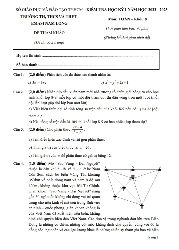 Bộ đề tham khảo học kỳ 1 môn Toán lớp 8 năm học 2022 – 2023 của trường EMASI Nam Long TP HCM đã được Sytu giới thiệu đến quý thầy, cô giáo và các em học sinh lớp 8. Đề thi được biên soạn theo hình thức tự luận với thời gian làm bài là 90 phút. Đề thi bao gồm đáp án, hướng dẫn giải chi tiết và thang điểm.Một trong các câu hỏi trong đề thi là về việc tổ chức giải bóng rổ cho học sinh khối lớp 8-9, với mỗi lớp cử một đội tham dự. Học sinh được yêu cầu viết biểu thức đại số tính tổng số trận đấu của khối lớp 8-9 và tìm số lớp tham dự nếu biết tổng số trận đấu. Câu hỏi khác liên quan đến phân thức, yêu cầu học sinh tìm điều kiện xác định, rút gọn phân thức, tính giá trị của biểu thức và tìm giá trị của để phân thức có giá trị bằng một giá trị cụ thể.Ngoài ra, đề thi còn đưa ra bài toán về mỏ dầu khí “Sao Vàng – Đại Nguyệt” ở bể Nam Côn Sơn, nằm ở độ sâu và cách bờ biển Vũng Tàu một khoảng cách nhất định. Học sinh được yêu cầu tính diện tích vùng biển bên trong tứ giác ra hải lý vuông dựa trên các thông tin về khoảng cách giữa các vị trí được cung cấp.Đề tham khảo học kỳ 1 môn Toán lớp 8 năm học 2022 – 2023 của trường EMASI Nam Long TP HCM không chỉ giúp học sinh ôn tập kiến thức mà còn giúp họ rèn luyện kỹ năng giải bài toán và tư duy logic.endphp