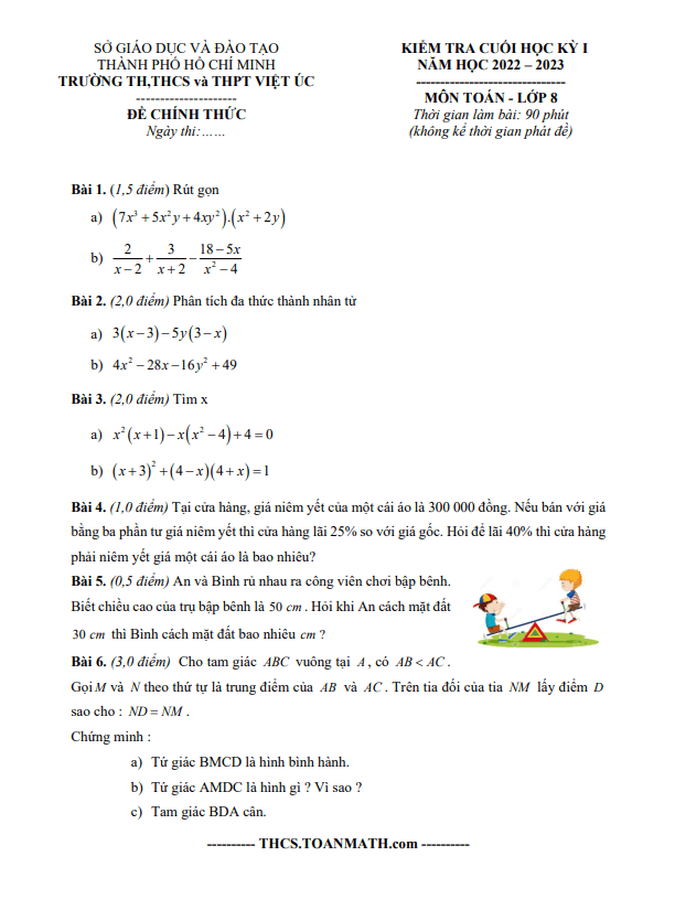 Đề tham khảo học kì 1 môn Toán lớp 8 năm 2022-2023 trường Việt Úc TP HCM