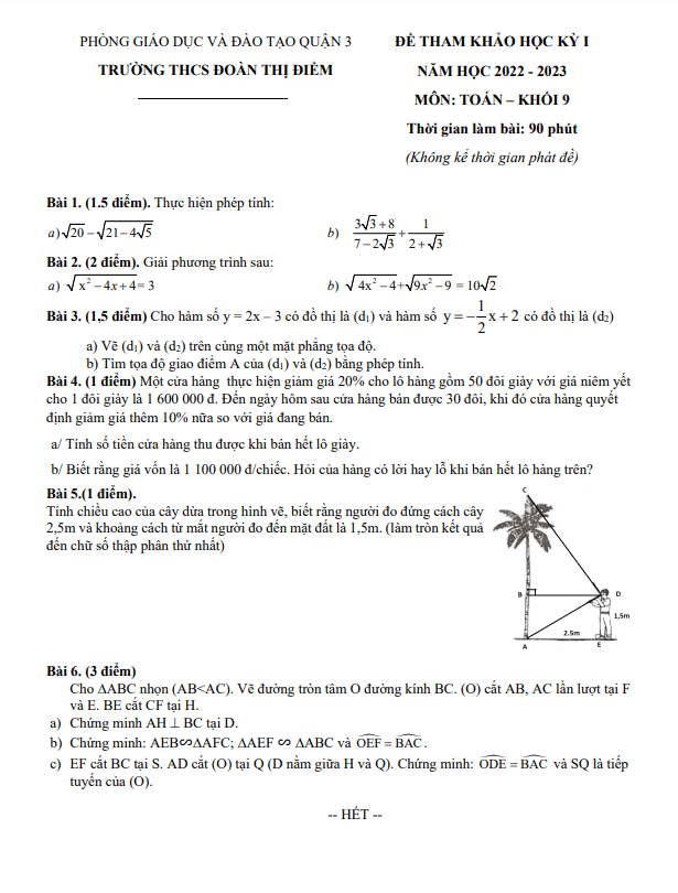 Trích dẫn Đề tham khảo học kì 1 Toán lớp 9 năm 2022 – 2023 trường THCS Đoàn Thị Điểm – TP HCM: