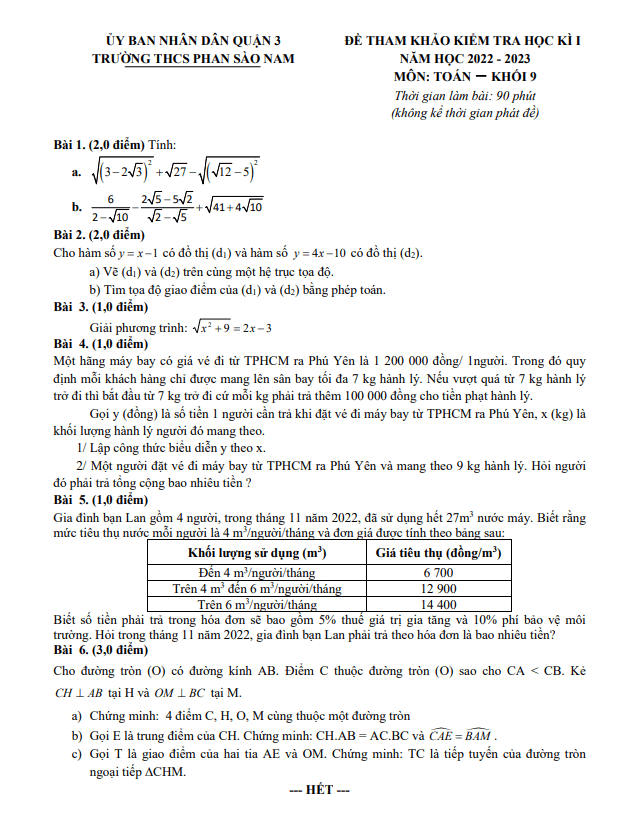 Đề tham khảo học kì 1 Toán lớp 9 trường THCS Phan Sào Nam TP HCM