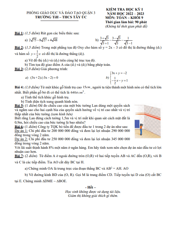 Đề tham khảo học kì 1 môn Toán lớp 9 (HK1) năm học 2022 – 2023 của trường TiH – THCS Tây Úc, TP HCM đã được Sytu giới thiệu đến quý thầy cô và các em học sinh. Đề thi được thiết kế theo hình thức tự luận, thời gian làm bài 90 phút, không kể thời gian giao đề. Đề thi bao gồm đáp án, hướng dẫn giải chi tiết và thang chấm điểm.Cụ thể, đề thi bao gồm các bài toán sau:1. Tính thể tích khúc gỗ hình trụ từ một khúc gỗ cao 15cm, biết phần gỗ bỏ đi có thể tích 640 cm3.2. Tính diện tích xung quanh hình nón được tạo ra từ khúc gỗ trên.3. Xác định chiều cao của bức tường mà Lan đang đo độ cao, biết vị trí mắt của Lan cách mặt đất 0,9m và cách tường 1,5m.4. Tính toán lợi nhuận của hai dự án đầu tư, với thông tin chi tiết về chi phí đầu tư và lợi nhuận trong 2 năm, để xác định dự án nào mang lại lợi nhuận cao hơn với lãi suất 8% một năm.File Word đã được chuẩn bị để quý thầy, cô có thể tải về và sử dụng. Hy vọng đề thi sẽ giúp các em học sinh lớp 9 rèn luyện kỹ năng giải bài toán và chuẩn bị tốt cho kỳ thi cuối kì 1. Hãy cùng nhau cố gắng và đạt kết quả cao trong học tập!