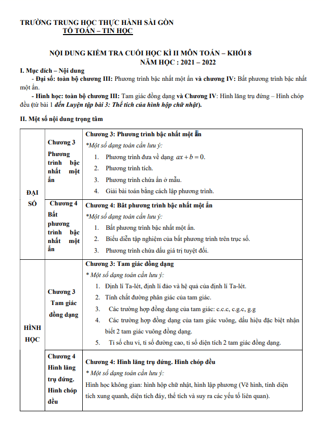 Đề tham khảo học kì 2 (HK2) lớp 8 môn Toán năm 2021-2022 trường Thực hành Sài Gòn TP HCM