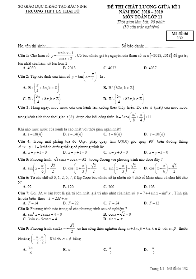 Đề thi chất lượng giữa kỳ 1 Toán lớp 11 năm 2018 – 2019 trường THPT Lý Thái Tổ – Bắc Ninh mã đề 132 bao gồm 50 câu hỏi với các dạng bài toán trắc nghiệm khách quan. Thời gian làm bài là 90 phút (không tính thời gian giám thị phát đề). Kỳ thi này được tổ chức thường xuyên nhằm đánh giá toàn diện kiến thức mà học sinh đã học trước đó, đồng thời giúp giáo viên nắm được chất lượng từng học sinh, từ đó điều chỉnh phương pháp giảng dạy phù hợp cho giai đoạn mới.