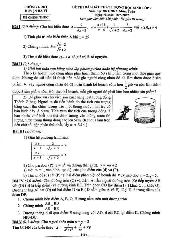 Dưới đây là một số câu hỏi trong đề thi chất lượng Toán lớp 9 năm 2021-2022 của phòng GD&ĐT Ba Vì – Hà Nội:
