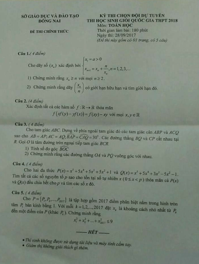Đề thi chọn đội dự tuyển thi HSG Quốc gia THPT 2018 môn Toán sở GD và ĐT Đồng Nai