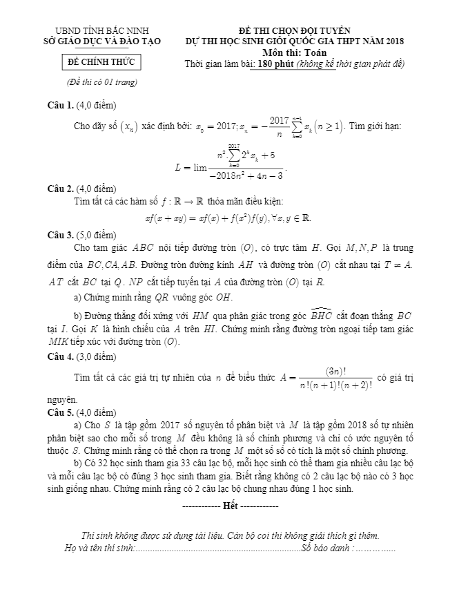 Đề thi chọn đội tuyển dự thi HSG Quốc gia THPT 2018 môn Toán sở GD và ĐT Bắc Ninh là bài thi có tính chất khó, đòi hỏi sự tỉ mỉ, logic và kiến thức sâu rộng từ các thí sinh. Đề thi gồm 5 bài toán tự luận, thời gian làm bài 180 phút, đề có lời giải chi tiết và thang điểm.