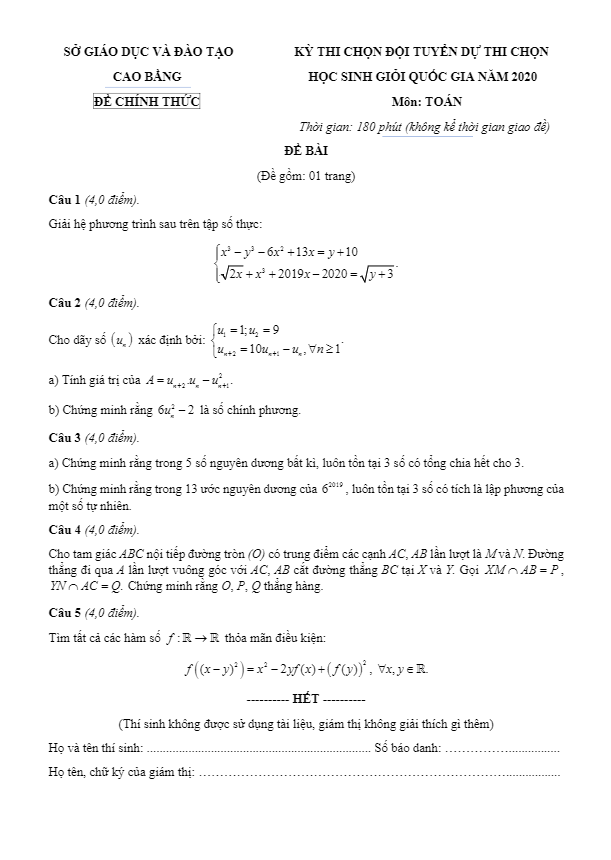 Trong số đề thi chọn đội tuyển học sinh giỏi Toán năm 2020 của sở GDĐT Cao Bằng, có các câu hỏi như sau: