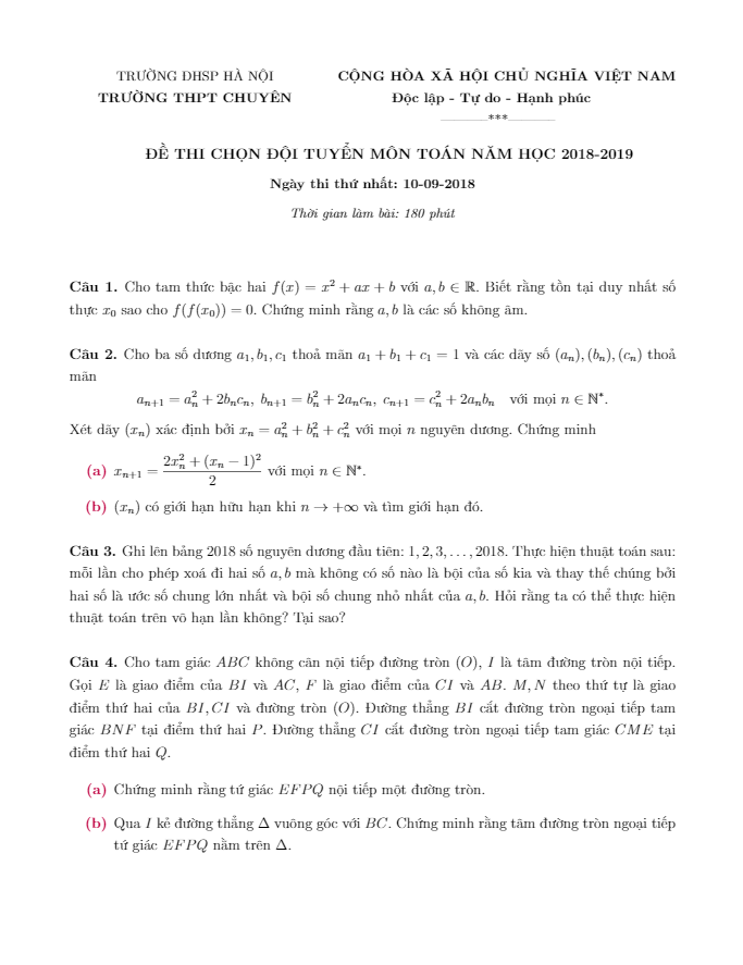 Đề thi chọn đội tuyển môn Toán năm 2018 – 2019 trường THPT chuyên ĐHSP Hà Nội