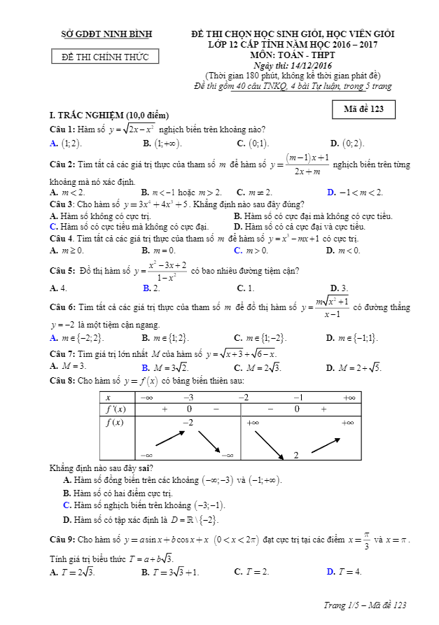 Đề thi chọn học sinh giỏi môn Toán lớp 12 năm học 2016 – 2017 của sở GD và ĐT Ninh Bình được chia thành 2 phần chính: