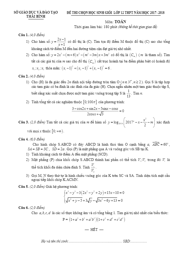Đề thi chọn học sinh giỏi Toán lớp 12 THPT năm học 2017 – 2018 của sở GD và ĐT Thái Bình bao gồm 6 bài toán tự luận. Đề thi có lời giải chi tiết và thang điểm để giúp học sinh hiểu rõ bài toán và cách giải.