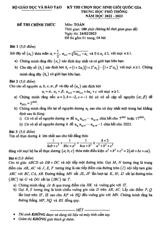 Đề thi chọn học sinh giỏi Quốc gia môn Toán THPT năm học 2022 2023