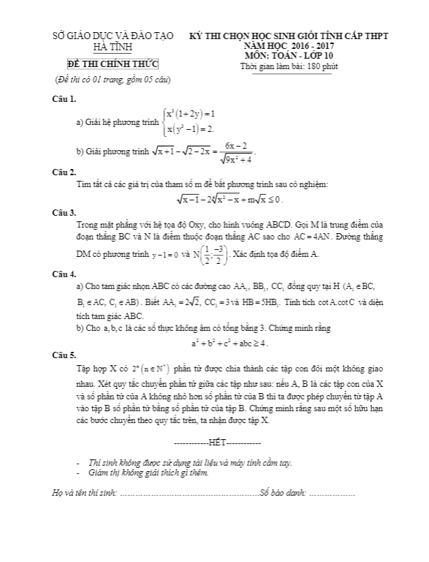 Đề thi chọn học sinh giỏi toán lớp 10 Hà Tĩnh năm học 2016-2017