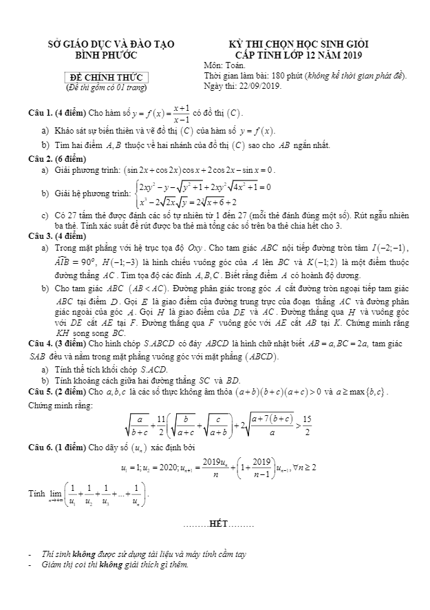 Đề thi chọn học sinh giỏi tỉnh Toán lớp 12 năm 2019 sở GD&ĐT Bình Phước bao gồm 06 bài toán tự luận, với thời gian làm bài là 180 phút.