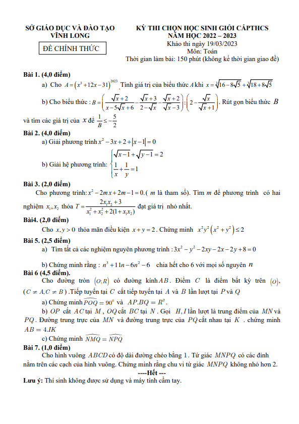 Đề thi chọn học sinh giỏi Toán THCS năm 2022 – 2023 sở GD&ĐT Vĩnh Long