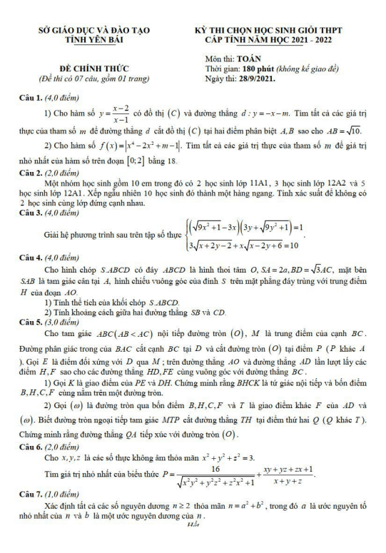 Đề thi chọn học sinh giỏi Toán THPT cấp tỉnh năm 2021 – 2022 sở GD&ĐT Yên Bái bao gồm một trang với bảy bài toán dạng tự luận, thời gian làm bài 180 phút. Kỳ thi được tổ chức vào ngày 28 tháng 09 năm 2021.