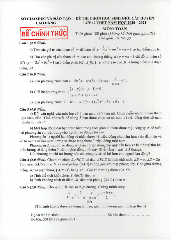 Đề thi chọn HSG cấp huyện Toán lớp 12 năm 2020-2021 sở GD&ĐT Cao Bằng