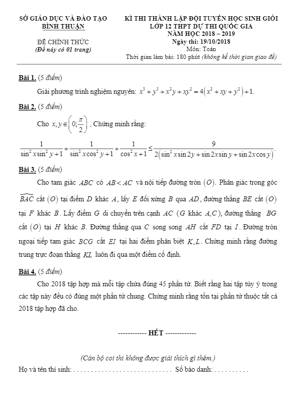 Đề thi chọn HSG cấp tỉnh Toán lớp 12 năm 2018 – 2019 sở GD và ĐT Bình Thuận (Vòng 2) bao gồm 1 trang với 4 bài toán tự luận, thời gian làm bài 180 phút. Kỳ thi được diễn ra vào ngày 19 tháng 10 năm 2018 nhằm thành lập đội tuyển học sinh giỏi Toán lớp 12 dự thi Quốc gia. Đề thi này cung cấp lời giải chi tiết và thang chấm điểm.