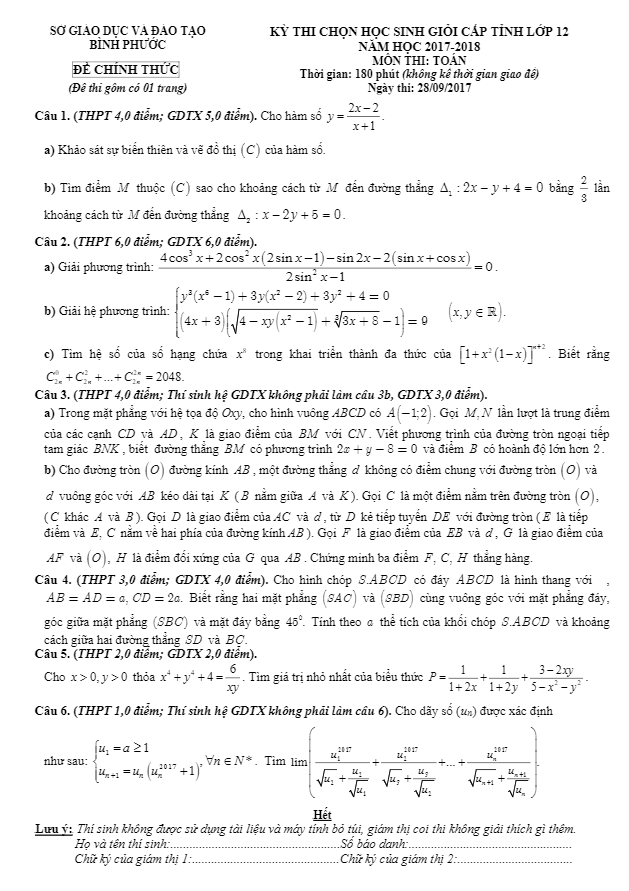 Đề thi chọn HSG cấp tỉnh Toán lớp 12 năm học 2017 – 2018 sở GD và ĐT Bình Phước là bài thi đầy thách thức với các bài toán phức tạp. Đề thi bao gồm 6 bài toán tự luận, với lời giải chi tiết và thang điểm, phù hợp cho cả học sinh khối lớp THPT và GDTX.