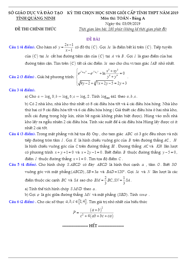 Ngày 03/09/2019, sở Giáo dục và Đào tạo tỉnh Quảng Ninh đã tổ chức kỳ thi chọn học sinh giỏi cấp tỉnh môn Toán lớp 12 khối THPT năm học 2019-2020. Đề thi chọn HSG cấp tỉnh Toán lớp 12 THPT năm 2019 sở GD&ĐT Quảng Ninh bao gồm 01 trang với 06 bài toán, thời gian làm bài 180 phút.