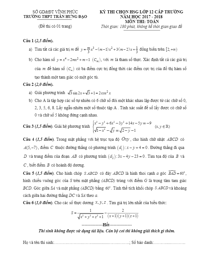 Đề thi chọn HSG cấp trường năm học 2017 2018 môn Toán trường Trần Hưng Đạo Vĩnh Phúc