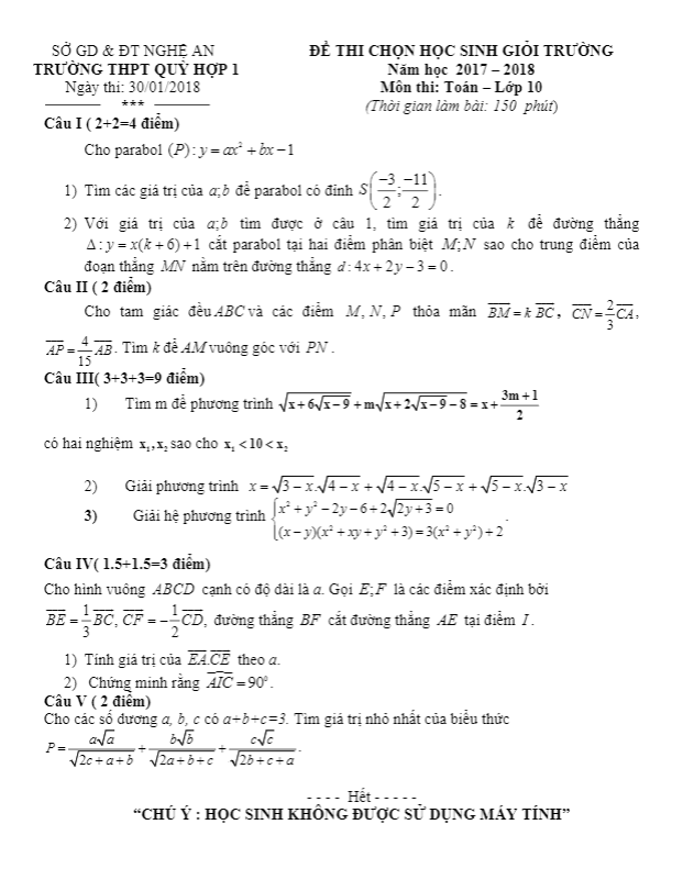 Đề thi chọn HSG Toán lớp 10 năm học 2017 – 2018 trường THPT Quỳ Hợp 1