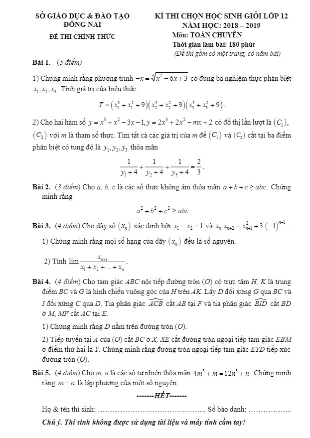 Đề thi chọn HSG Toán lớp 12 chuyên năm học 2018 – 2019 sở GD&ĐT Đồng Nai bao gồm một trang với năm bài toán tự luận. Thời gian làm bài là 180 phút. Kỳ thi được tổ chức vào ngày 18 tháng 01 năm 2019 để tuyển chọn những học sinh giỏi môn Toán đang theo học chương trình chuyên tại tỉnh Đồng Nai. Mục tiêu của kỳ thi là tuyên dương, khen thưởng và thành lập đội tuyển học sinh giỏi tỉnh Đồng Nai để tham gia kỳ thi học sinh giỏi Toán chuyên cấp Quốc gia.