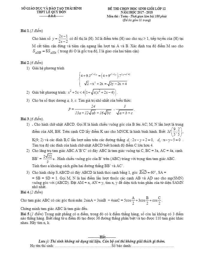 Đề thi chọn HSG Toán lớp 12 năm học 2017 – 2018 trường THPT Lê Quý Đôn – Thái Bình