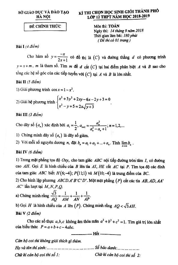 Đề thi chọn Học sinh giỏi (HSG) môn Toán lớp 12 THPT năm học 2018 – 2019 của sở Giáo dục và Đào tạo Hà Nội bao gồm 1 trang với 5 bài toán tự luận. Thời gian làm bài cho thí sinh là 180 phút. Kỳ thi này được tổ chức vào ngày 14 tháng 09 năm 2018 nhằm tìm kiếm các học sinh lớp 12 có khả năng và đam mê với môn Toán, nhằm mục đích bồi dưỡng và đào tạo cho họ.