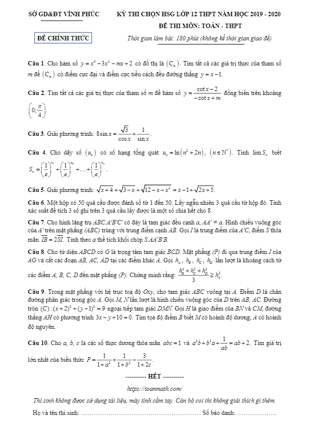 Đề thi chọn HSG lớp 12 môn Toán THPT năm học 2019 2020 sở GD ĐT Vĩnh Phúc